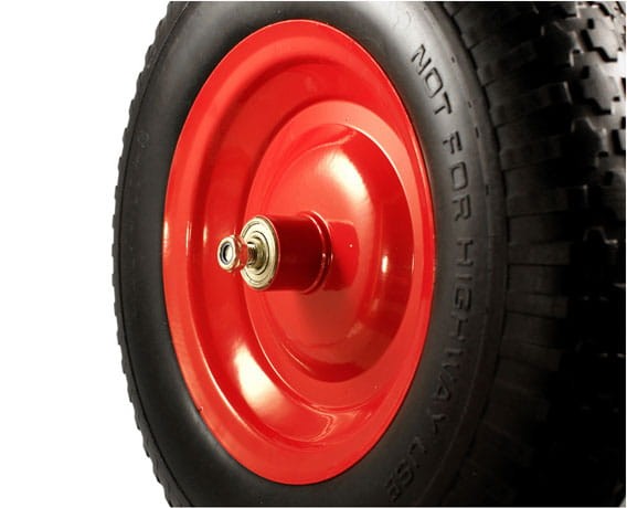 Koło wyposażone zostało w dwa łożyska kulkowe, które zapewniają płynne toczenie i komfort prowadzenia taczki nawet przy większym obciążeniu. Metalowa tuleja umieszczona pomiędzy łożyskami stabilizuje całość i zapobiega ocieraniu o konstrukcję po skręceniu koła.